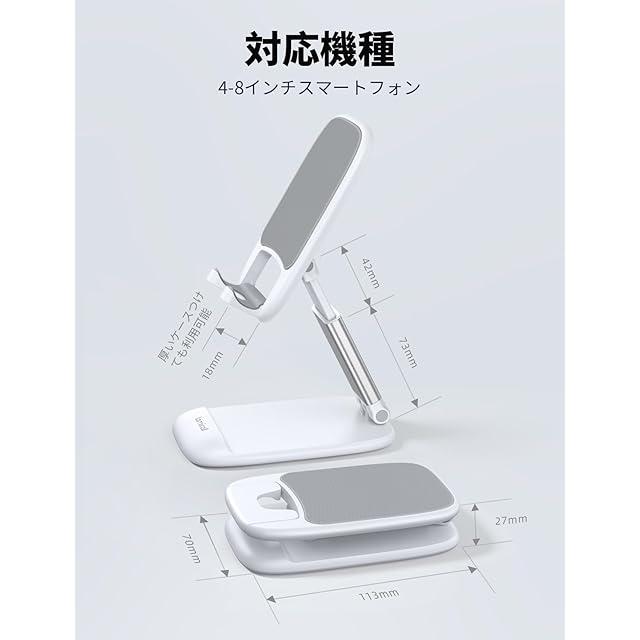 【対応機種】約4-8インチ機種に対応可能。iPhone 16e 16 15 14 plus pro promax 13 mini iPhone 12 mini Pro Max 11pro 11 XS XR X 8 plus 7 7plus 6s 6 6plus 5 5s se3 第三世代, Xperia 1 5 Ⅴ Ⅳ XZ2 XZ3 X Z4 Z5,Galaxy S24 S25 Ultra,Note 7 8 9 10+ 20,Z Fold 4 5 6,S5 edge S6 edge S7 edge,A8S A9S A70,W25 W26 Flip,huawei Mate Nova P70 Pro,Xiaomi androidなど。フックの寸法は18mmであるので、保護ケースをつけたままに製品をご利用になる方が、ご購入になる前に是非機体全体の厚さをご確認ください。<br> 【調整可能】回転軸が二箇所あり、高さを調節でき、台座の傾斜角度も自由に変えられ、お好みの位置に快適に固定できます。ミリ単位で細かな調整可能し、使用中に下がってくるようなことも無く、頑丈で安定します。かなり固い稼動部に支えられ、スマホを何度も触っても振動せず操作でき、きれいな平衡感覚ができます。<br> 【安定性抜群】スマホに接触する面やフックに滑り止め用のシリコン製パッドを採用し、水平に置けて落下防止でき、安定性に感心できます。底面にも滑り止めラバーがあるので、卓上にしっかり固定でき、スタンドの安定性を向上させます。強い固定した台座が、スマホを載せる時の不快な前後揺れを最小限に抑えられ、大切なスマホを傷からちゃんと守ります。<br> 【耐久性】耐衝撃性の高いABS樹脂素材であり、また良い耐熱性や耐低温性に加え、非常に堅固な質があります。長く使っても壊れにくいし、ペンキも落ちにくいです。ねじをつけず一体型の繋がりであり、ねじの錆びることを心配せず長い時間にスタンドを利用できます。<br> 【ハンズフリー】台座から底へと十分なスペースがあるので、小物を収納可能だけではなく、スマホをスタンドに置いたまま充電もできます。折り畳み式であり、大変な重さを感じずポケットサイズを持ち、誰でも適して持ち運びやすいです。メール受信を確認することなどが非常に便利であり、家でも楽にスマホライフできるようになる必需品です。カフェや新幹線、飛行機移動中、出張、旅行、展示会など様々シーンにも活躍できます。