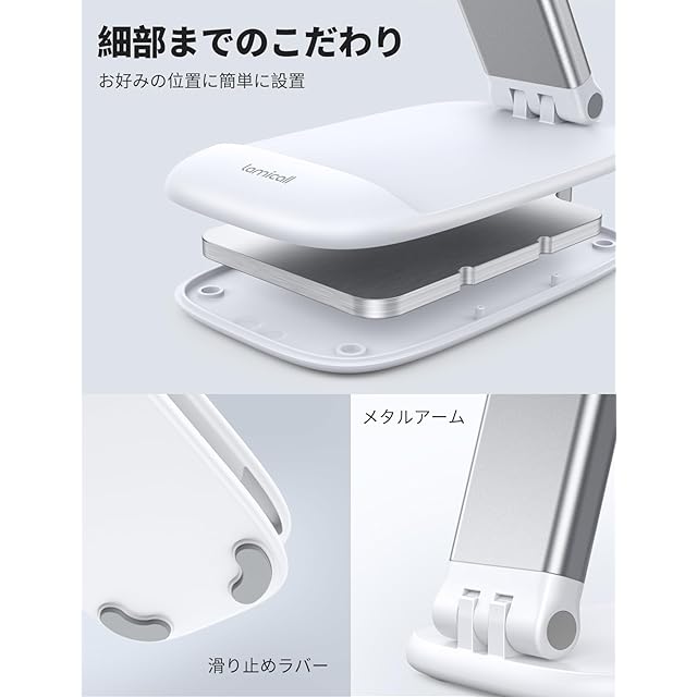 商品名:Lamicall 1個セット 折り畳み 高さ調整 スマホスタンド 伸縮 : 角度 折りたたみ 携帯 アイホン すまほ スマホ 立て 置き 台 卓上 机 つくえ デスク 縦 横 滑り止め コンパクト アイフォン スマフォ アンドロイド iPhone 16e 16 15 14 plus pro promax 13 mini プロ マックス se Huawei Xperia android に対応 白