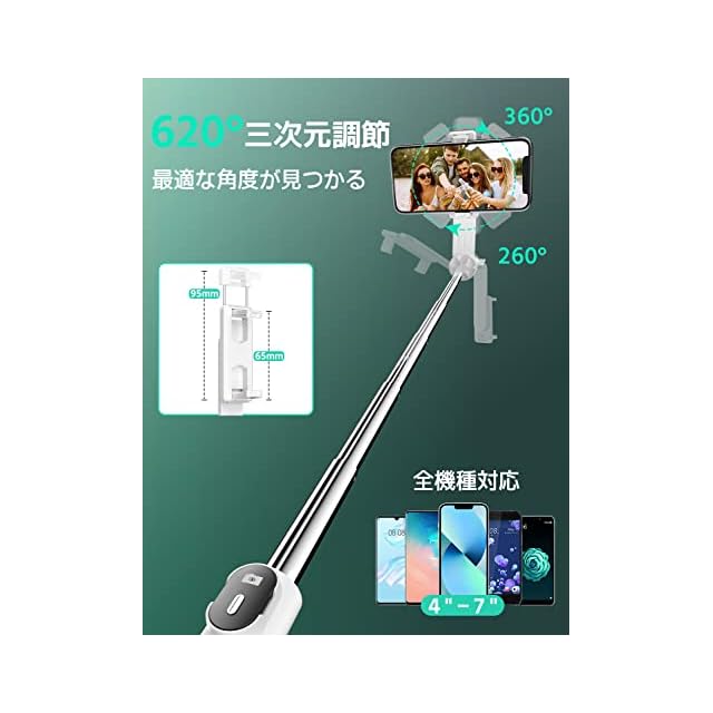 【360°+260°全方位自由調節】自 撮り 棒のクランプは従来型にある水平360°回転を受け継いだ以外、より一層改良できたところは上下260°回転実現、撮影角度を気にする必要はありません。横幅4~7インチのスマホをじどり棒のホルダーに装着するのが可能、小さい端末でも、大画面の端末でもしっかり固定できます!