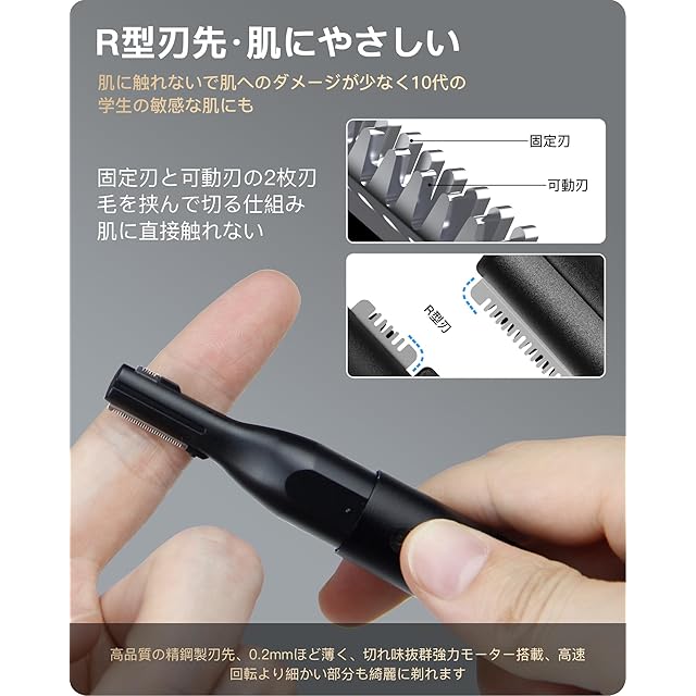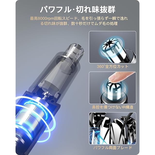 【一台3役の多機能電動鼻毛カッター メンズ】鼻毛カッター本体のヘッドを簡単に交換することにより、エチケットカッター、眉毛シェーバー、耳毛カッター、ヒゲシェーバーとしてご利用いただけます。ヘッドはひねると外れる仕様で簡単に交換できます。したがっていつでもトリミングできます。はな毛カッター 男性は高速回転モーターとダブルブレードが内蔵された人間工学に基づいた立体設計。安全性が高く、無駄毛を素早くカットでき、鼻腔にもびったりとフィットし、奥まできれいにカットできます。鼻毛 カッターのワンタッチ設計は使いやすい、男女兼用、いつでもどこでも最も自信のある一面を見せることができます。