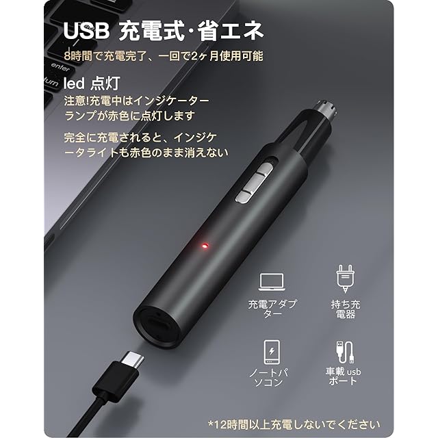 【microUSBポート&持ち運び便利】鼻毛カッター 充電式本体は付属のmicroUSBケーブルで簡単に充電できます。バッテリーには高性能バッテリーを使用しています。スマートフォン用のmicroUSB充電器でも充電は可能なので外出先での充電も便利です。バッテリの挿入と交換の手間を解消します。一度フル充電いたしますと、最大3か月間使用できます。充電時には鼻毛剃り本体の電源が「オフ」状態になっていることを確認してから充電を始めてください。なお鼻毛そり 電動の充電時間は12時間を超えないようご注意ください。