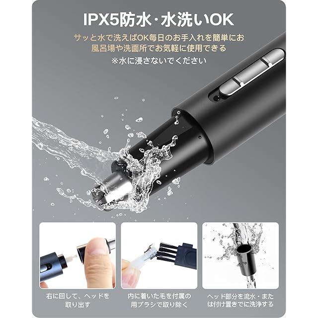 【IPX5防水&お手入れが簡単】電動カミソリ 男性用は防水できます。鼻毛切りの先端は、外して直接にすすぐことができ、残留物や細菌の繁殖を防ぎ、いつでも清潔に保つことができます。まゆけシェーバーはヘッドを取り外して洗うこともできます。 ユニークな双頭清掃ブラシは、髭剃り 電動 メンズシェーバーを簡単にお手入れができながら、眉毛剃りの清潔を保つことができます。注意:洗浄後すぐに水の汚れを拭き取り、産毛カッター本体を水に浸さないでください。