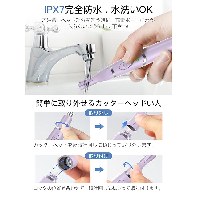 【IPX7防水&お手入れが簡単】電動眉毛シェーバーはIPX7防水標準なので、本体は便利な替ヘッド式デザインで、眉毛カッターや鼻毛カッターのヘッドを直接取り外して水洗いできるので、残留物や細菌の繁殖を防ぎ、簡単なお手入れで清潔に保つことができます。また、掃除用ブラシが付属して、刃と本体についた毛くずを掃除します。注意:本体底部にtype-cポートを搭載しておりますので、水に触れると故障になりやすい為、水洗いの際はご注意下さい。