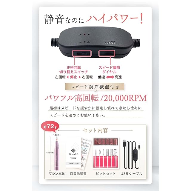 「指先を傷つけない」をモットーに工場と何度も打ち合わせを重ねて発売させて頂いた RENAGE ネイルマシン「ジェルネイル初心者さんがやりがちな5つの間違い」や「甘皮は爪に必要だからとっちゃダメって本当?」など、ネイル関連動画を投稿している人気YouTuberASKAさん監修のネイルマシンがついに販売を開始致しました!!RENAGEネイルマシンは1分間で20,000回転するパワフルモーターを搭載しています!更に左右両回転機能もついていますので、右手と左手のネイルもこれ1本で簡単にオフ出来ちゃいます!ネイルオフでよくあるお悩みNo.1は「爪を削り過ぎてしまった・・・。」です。爪を削り過ぎてしまう大きな原因は「正しいビットの選択」と「マシンの使い方」にあります。RENAGEネイルマシンは回転速度調節機能が付いていますので、慣れるまではゆっくりと削り、慣れてきたら徐々にスピードを上げる事で爪の削り過ぎを抑えます!