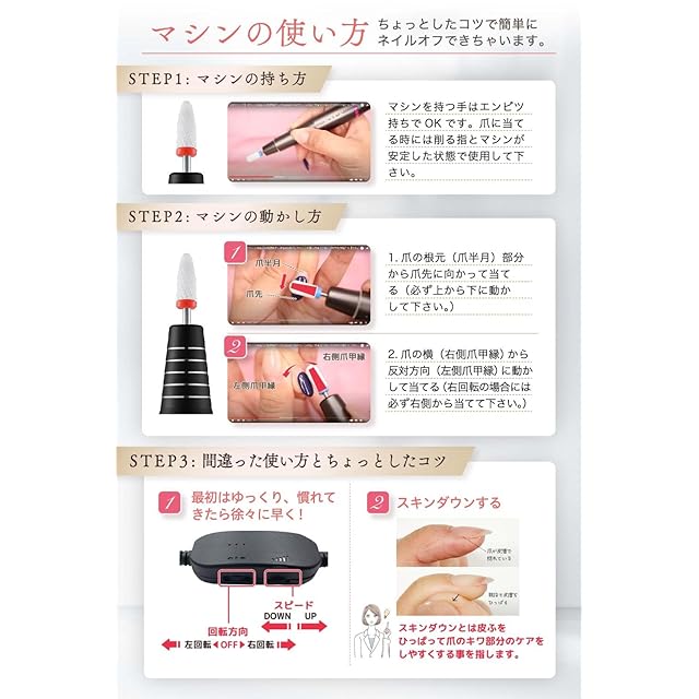 【登録者数75,600人突破!人気YouTuberが監修】人気YouTuberネイリストのASKAさん監修「初めてのネイルオフだから心配・・・。」「指先を傷つけてしまいそうで怖い・・・。」そんなお悩みをお持ちの方にも安心してお使い頂けるよう、ジェルネイルオフの基本操作から甘皮処理などの指先のケアまで、分かりやすい解説動画をお付け致します。取扱説明書と解説動画を見ればジェルネイルを始めたての初心者さんでも簡単にお使い頂けます。