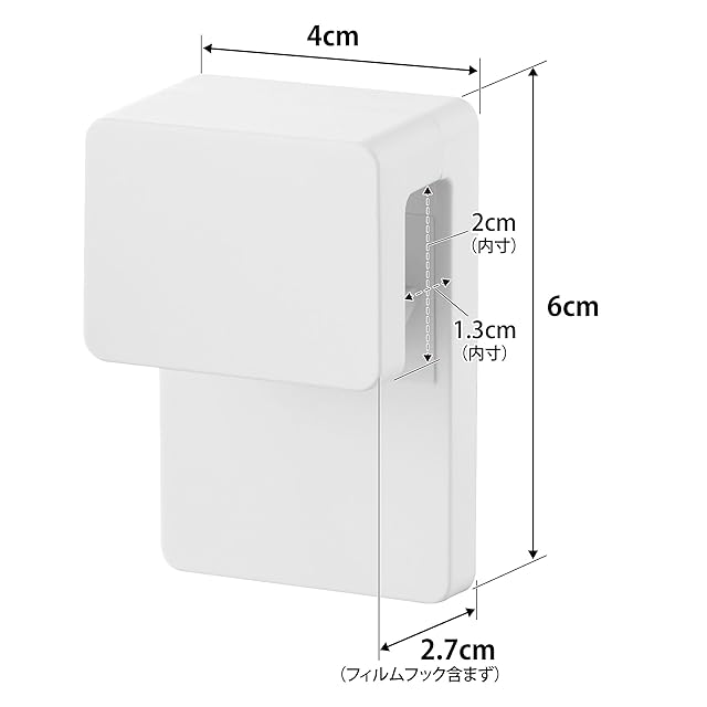 商品サイズ 本体:W4×D2.7×H6cm(1つあたり・フィルムフック含まず) フィルムフック接着面:W4×H6cm(1つあたり) ▪商品重量:25g(1つあたり) ▪内寸:W4×D1.3×H2cm