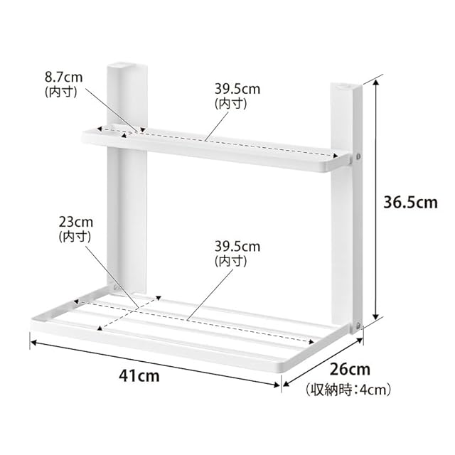 商品サイズ 使用時:W41×D26×H36.5cm 収納時:W41×D4×H36.5cm ▪商品重量:2000g ▪内寸 トレー:W39.5×D8.7cm 棚:W39.5×D23cm
