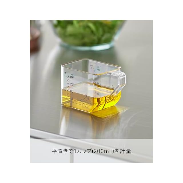 平置きで1カップ、斜め置きで大さじ計量ができる便利な2WAY 計量カップです。食洗機OK。電子レンジOK。