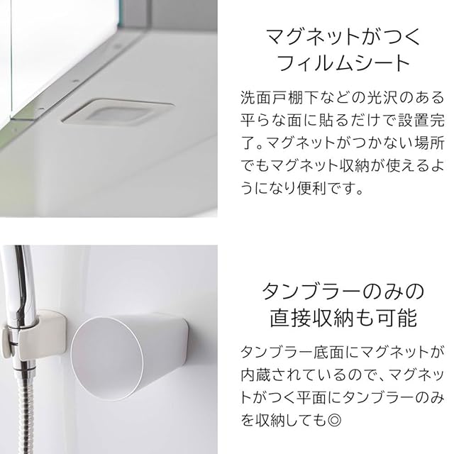 [取り付け可能な面]フィルムシート:光沢のある平らな油染みしない面でフィルムシートの接着面よりも大きい面・タイル・プラスチック・ステンレス・ガラス・金属塗装面・人工大理石、タンブラー:マグネットがつく平らな面・スチール壁面