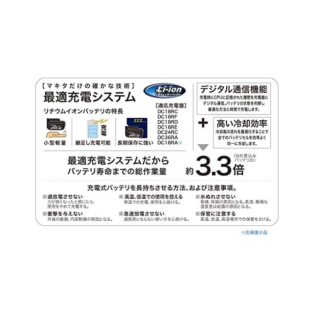 適合充電器:DC18RC / JPADC18RC ●「新・最適充電制御」対応。DC18RF使用時フル充電約40分※1、実用充電・約27分※1、※2