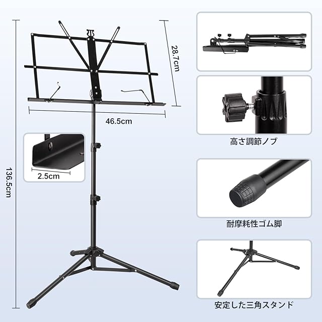 New Bee 譜面台 折りたたみ式 楽譜スタンド 高さ70~135cm 調節可能 楽譜立て 収納袋付き 黒 MS21