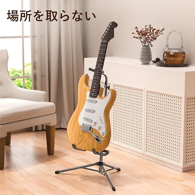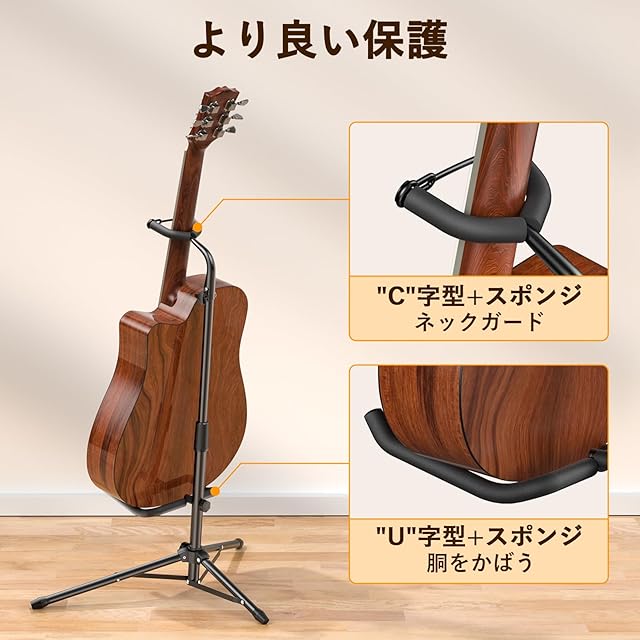 【三脚&滑り止め】滑り止め付きの三脚スタンドと転倒防止用ゴムにより、ギターは安定に固定できます。接点はスポンジ素材で覆われ、楽器に傷つくことはありません。
