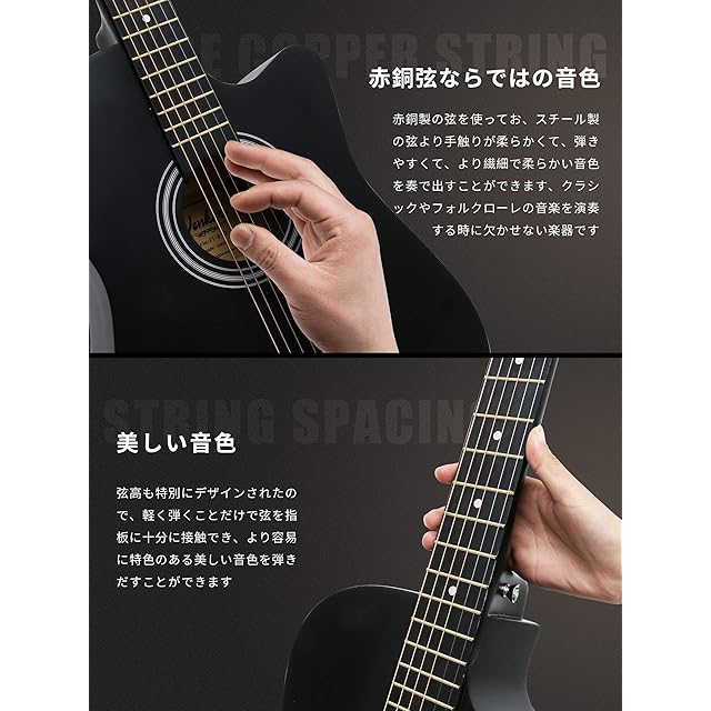 「仕上げとデザイン」アコースティックギターは職人の手で仕上げられ、初心者向けに調整された構造。上質な木材を使い、湿気処理と真空乾燥を施した高品質ギター。