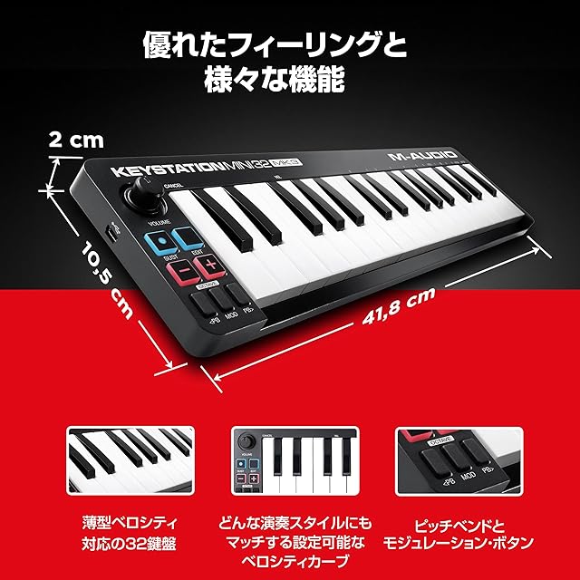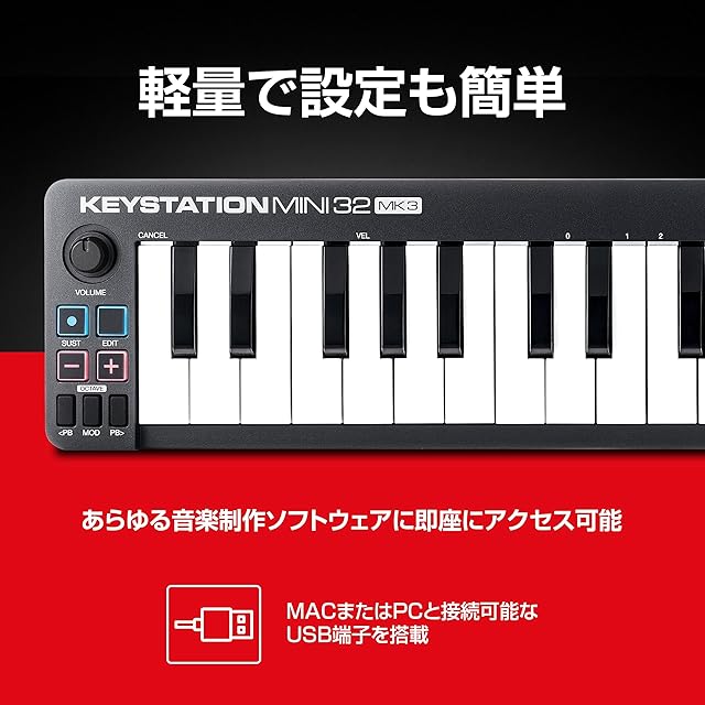 音楽製作にとって最も大事なものは、ベストなサウンドです。この理由からKeystationシリーズは、AirMusicTechが提供する高品位なプロ・グレードのバーチャル・インストゥルメントを付属しています。直感的な操作で何千ものプレミアムなパッチを標準搭載するXpand!2がバンドルされていますので、どんな状況においても直ぐにクリエイティブな製作・パフォーマンスを行うことができます。・32鍵盤の薄型でベロシティー対応ミニキーボード・USB-MIDI接続:バーチャル・インストゥルメントの演奏、DAWの操作などに対応・設定可能なベロシティカーブはどんな演奏スタイルにもマッチ・表現の幅を広げるピッチベンドとモジュレーション・ボタン・キーボードレンジ変更用のオクターブ上下ボタン・ボリューム・ノブでスムーズなコントロールが可能・サステイン・ボタンによりパフォーマンスが向上・EditModeボタンにより高度な設定可能