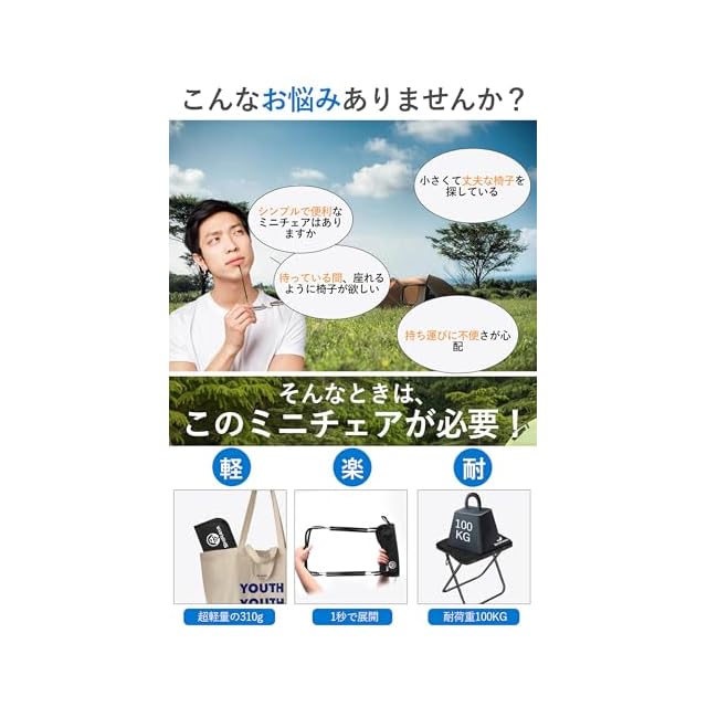 【コンパクトタイプ&安定性】僅か310gで水筒より軽いです。フレーム部分は6013アルミ素材でできており、軽いながら耐荷重は100kgに達しています。持ち手も付きますので、持ち運びに楽々、コンパクトで折りたたみ傘のように使えて便利です。座面は1000Dの厚手で丈夫な生地を使い、張りのある安定した座り心地と耐久性を兼ね備えました。また採用のオックスフォード生地は通気性もよく、快適に過ごすことができます。