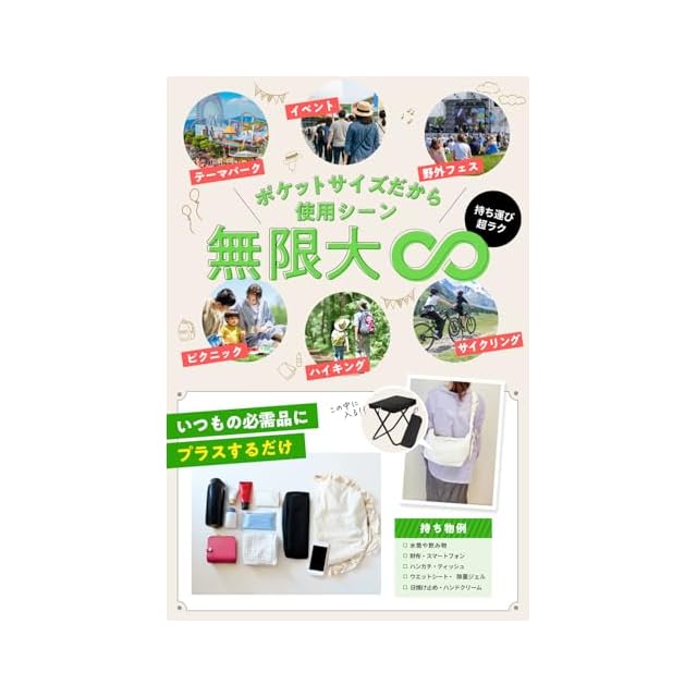 【超コンパクトテーマパークなどのお出かけに最適】家族でのお出かけなどにカバンに携帯できるようスマホ2台分の超コンパクトなサイズを実現しました。さらに座面がそのまま収納袋になるので、持ち運びも便利な簡易椅子となっております。持ち手部分にカラビナをつければ腰などにもぶら下げることが可能となっております。テーマパークや屋外フェス、万博などのイベント、ピクニック、サイクリング、災害時の緊急用、アウトドア、キャンプなどご使用方法は無限大です。