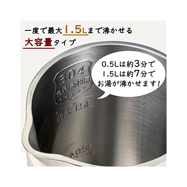 【ハイパワー】1200Wハイパワーで「飲みたい」と思った時にスピーディに沸騰。0.5Lを約3分間、1.5Lを約7分間でお湯が沸かせます。