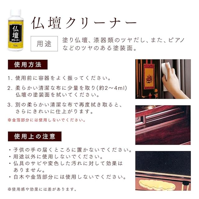 <b>その他 :</b> ●使用量の目安:仏壇、仏具とも4ml(1平方m) ●仏具クリーナーの液性:弱アルカリ性●仏具クリーナーが使えるもの:真鍮製仏具、または金属製仏具(リン、花立、ローソク立て、線香立て、線香さし、仏飯器、金具)