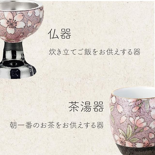 花立(お仏壇用花瓶)、灯立(ろうそく立て、燭台)、香炉(線香立て)の三具足とも一緒に使用しやすい、ミニサイズの仏具です。仏器(湯呑み)との併用も可能です。