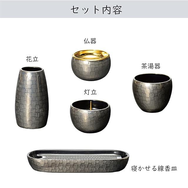 花立(お仏壇用花瓶)、灯立(ろうそく立て、燭台)、香炉(線香立て)の三具足とも一緒に使用しやすい、ミニサイズの仏具です。茶湯器(湯呑み)との併用も可能です。