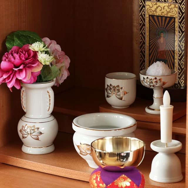 【サイズ】花立て:径5.4cm×高さ10.5cm、香炉:径9.3cm×高さ6.5cm、火立て:径4.3cm×高さ5cm、茶器:径4.5cm×高さ5cm、仏器:径5.4cm×高さ6cm、おリンセット:幅約7cm×高さ約9cm