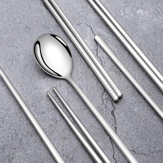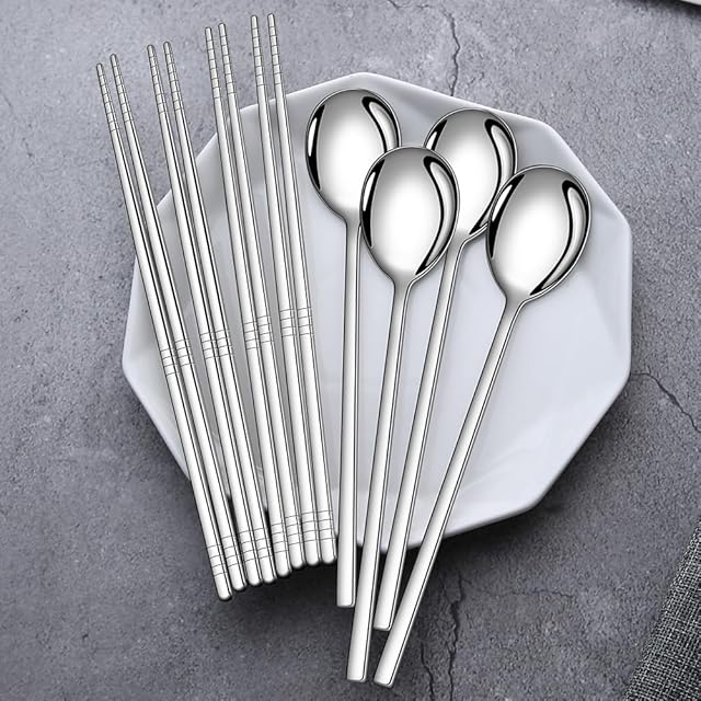 AOOSY スプーン 箸 4人用8点セット 食洗機対応カトラリーセット 四角形柄 韓国食器 ステンレス鋼製 鏡面仕上げ シルバー 軽いお箸 中空箸 来客用箸 業務用