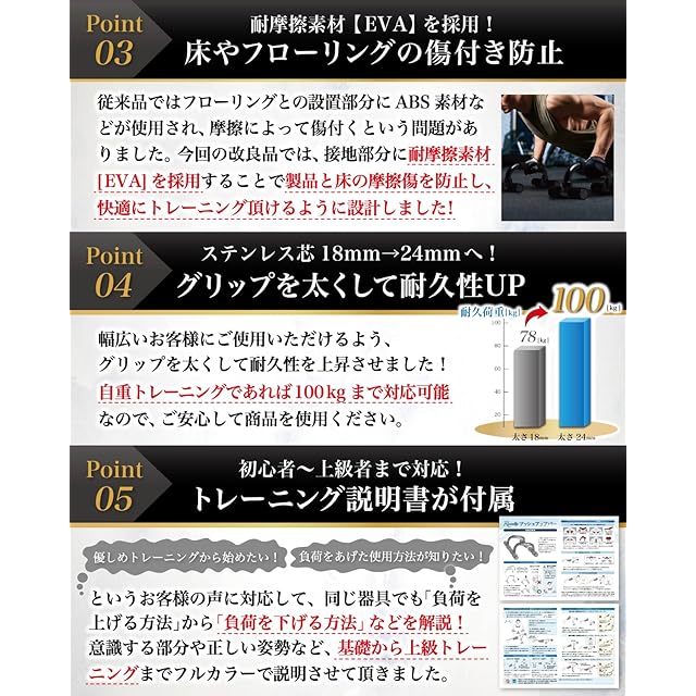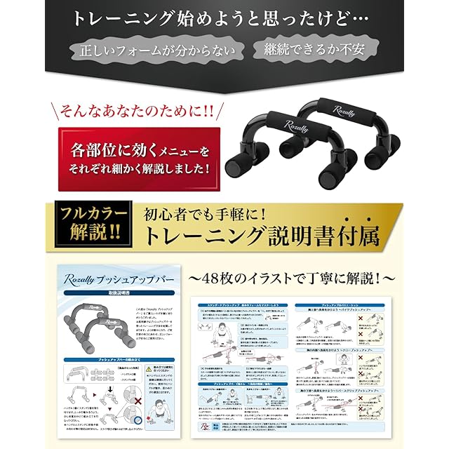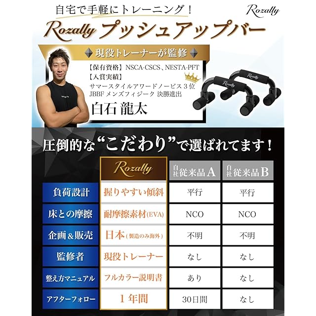 【商品の設計】 Rozally プッシュアップバー は仕事終わりの家で 静かに トレーニング ができるように、耐摩耗性の素材を採用することで、家でギシギシと摩擦が響かない”静音”の設計をさせて頂きました。従来品の プッシュアップバー では接続部分の素材が耐摩耗の素材となっていないことで、テレビを見ながら トレーニング したらギシギシうるさかった…という意見もあり設計から見直して製品化しました。 ボディーメイク や フィットネス でも 初心者 が手軽に扱える トレーニング器具 として話題沸騰中の商品になりますので、是非お試しください。