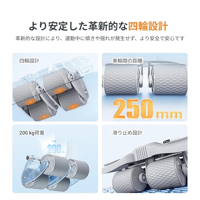 【より安定した四輪設計&静音&耐荷重200kg】革新的な四輪設計は腹筋ホイールの滑り止め設計に合わせて、騒音を減少させた上で、運動中の横揺れや転倒などによる不安を解消し、トレーニングをより安全で安心にします。耐荷重も200 kgにアップし、より多くの体重の方に合うようになりました。