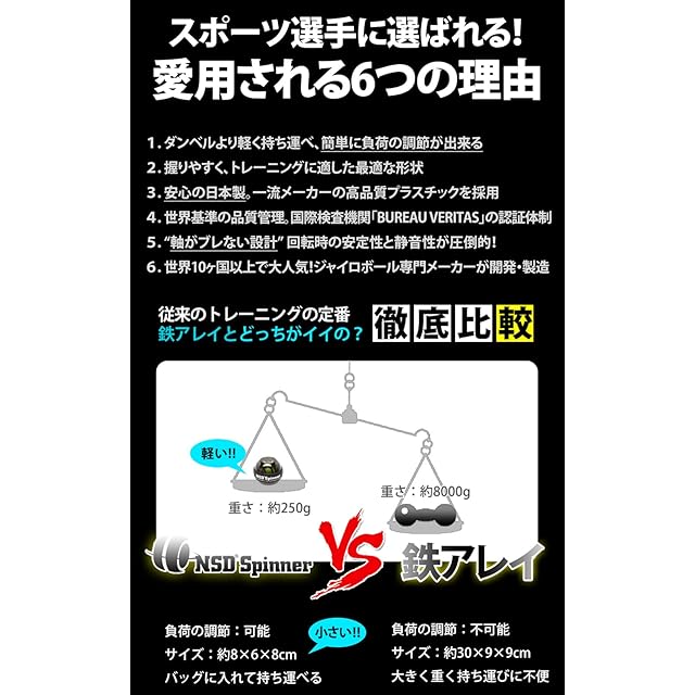 ⭕【 スポーツ選手が愛用する業界唯一の品質管理 】1.軸の安定性に優れた設計により、回転が均一で手首や前腕に均等に負荷がかかる 2.厳格な回転テストを行っており、回転がなめらか(圧倒的な音の違い) 3.握りやすく、トレーニングに適した形状 4.日本製一流メーカーのプラスチックを採用 5.検査機関『BUREAU VERITAS』による世界基準の品質管理体制