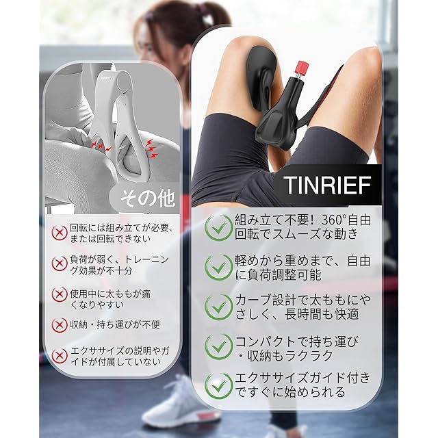【快適設計 & フィット感調整機能】脚内転筋トレーニング機器として、360度回転式プレートを搭載。太もも・膝・二の腕にフィットさせ、ないてんきん 筋トレ効率を最大化。スタティック式と異なり、内転筋トレーニングに最適な負荷配分を実現。肌触りの良い素材で長時間のないてんきんトレーニング器具使用も快適。