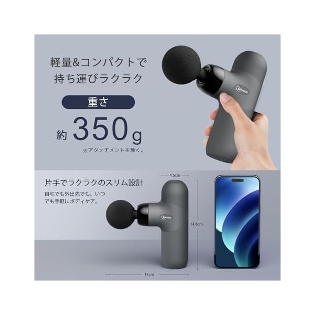 【調整可能な6つのヘッド&静かな動作音45dB】球形、U形、円柱形、平形のアタッチメントなどに交換可能。環境に優しい高品質の素材で作られたヘッドは、表面が柔らかく、使い心地が良いです。汗や汚れを気にせず使用できます。高トルクブラシレスモータを搭載し、ノイズを効果的に制御します。最大3800回/分で、作動音は45dB(日常会話程度)未満の非常に低騒音。深夜に使用しても周囲の人の邪魔にならず、いつでもどこでも使用を楽しめます。
