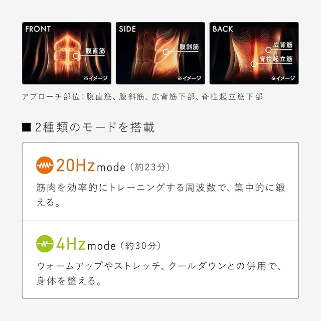 腹筋・脇腹・背筋を同時に鍛え、より力強く、バランスのとれた「体幹」へ。 ボディラインや姿勢を保つために大切な腹筋や脇腹、背筋※に同時にアプローチし、体幹を鍛え「Powersuit Core Belt」。2種類のモードを搭載し、有酸素運動や筋トレとの併用も可能。お腹周りに加え、後ろ姿も磨き上げてバランスが整ったボディを目指せます。