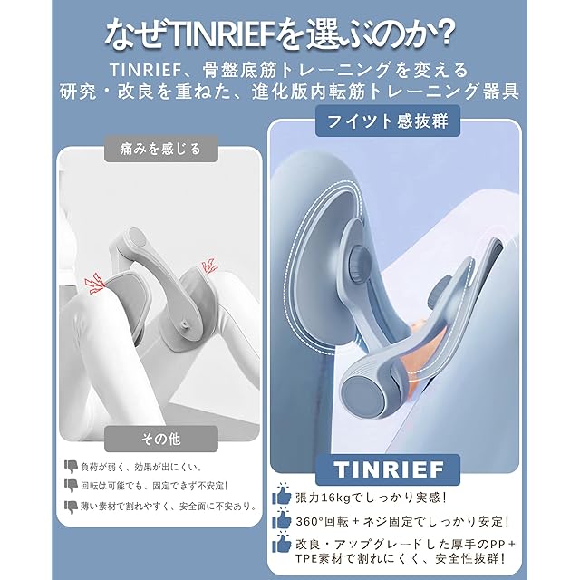 TINRIEF 内転筋トレーニング器具:人間工学に基づいて新たに開発・改良された、進化版トレーニング器具のご紹介です!本製品は、張力を16kg(約36ポンド)までアップグレードし、耐荷重46ポンドのレジスタンスプレートを搭載。オリジナルモデルを基に、アジア人の骨格特性を徹底的に研究し、日本人の体型にフィットするよう設計されています。この高い耐荷重性能により、女性・男性を問わず、幅広い年齢層やフィットネス初心者、ワークアウトを始めたばかりの方にも安心してご使用いただけます。ぜひ、自分にぴったりのトレーニングパートナーとしてお選びください!