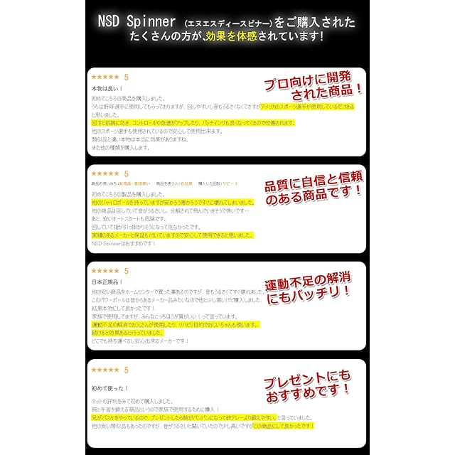 ⭕【 スポーツ選手が愛用する業界唯一の品質管理 】1.軸の安定性に優れた設計により、回転が均一で手首や前腕に均等に負荷がかかる 2.厳格な回転テストを行っており、回転がなめらか(圧倒的な音の違い) 3.握りやすく、トレーニングに適した形状 4.日本製一流メーカーのプラスチックを採用 5.検査機関『BUREAU VERITAS』による世界基準の品質管理体制