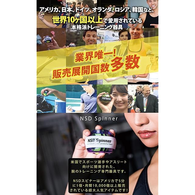 【手首、指、腕を鍛える専用の器具NSDスピナー中級者用 日常トレーニング向け】 <br> <br> NSDスピナーは世界中で愛され使用されており、本格的なアスリートから一般の方まで使用出来るスポーツ器具です。 <br>20年以上もの歴史の中で生み出されたハイテク技術により、現代のトレーニングにマッチしたジャイロエクササイズマシンの唯一のメーカー商品です。 <br> <br> 回転数が上がるほど遠心力が増していき、重みも増してきます。手首や腕、指の筋力増加のための運動器具として非常に高い効果が期待出来ます。 <br> <br> デジタルカウンター&オートスタートモデル <br> 回転数測定モード <br>スピード測定モード <br>最高回転数測定モード <br>トレーニング測定モード <br> <br> 紐なしで回転してくれるモデルでスタートが苦手な人にはおすすめです。 <br> <br>腕のダイエットにも有効です。 <br> 重たいダンベルなどの器具を使用するより、はるかに安全でそして筋肉に過度な負荷をかけずにすみます。 <br> パワースピナー正規品は他の製品と違い、精密に設計された最高品質のノン・インパクト(非衝撃)トレーニング/リハビリツールです。 <br>比べていただくとその違いに驚かれることでしょう。安心してお買い求め下さい。 <br> <br> たった5分、テレビを見ながら腕、手首の筋力、握力のアップを目指しましょう。 <br> このNSDスピナーを使用して、快適なトレーニングをお楽しみ下さい。
