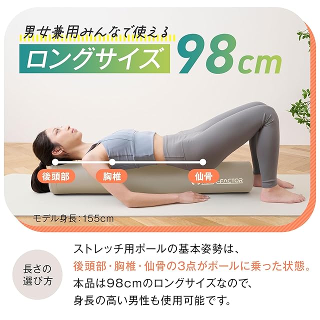 ✅ハルクファクターのストレッチ用ポール(エクササイズポール)は98cmのロングサイズ。男女問わず、無理なく上半身を載せることができます。