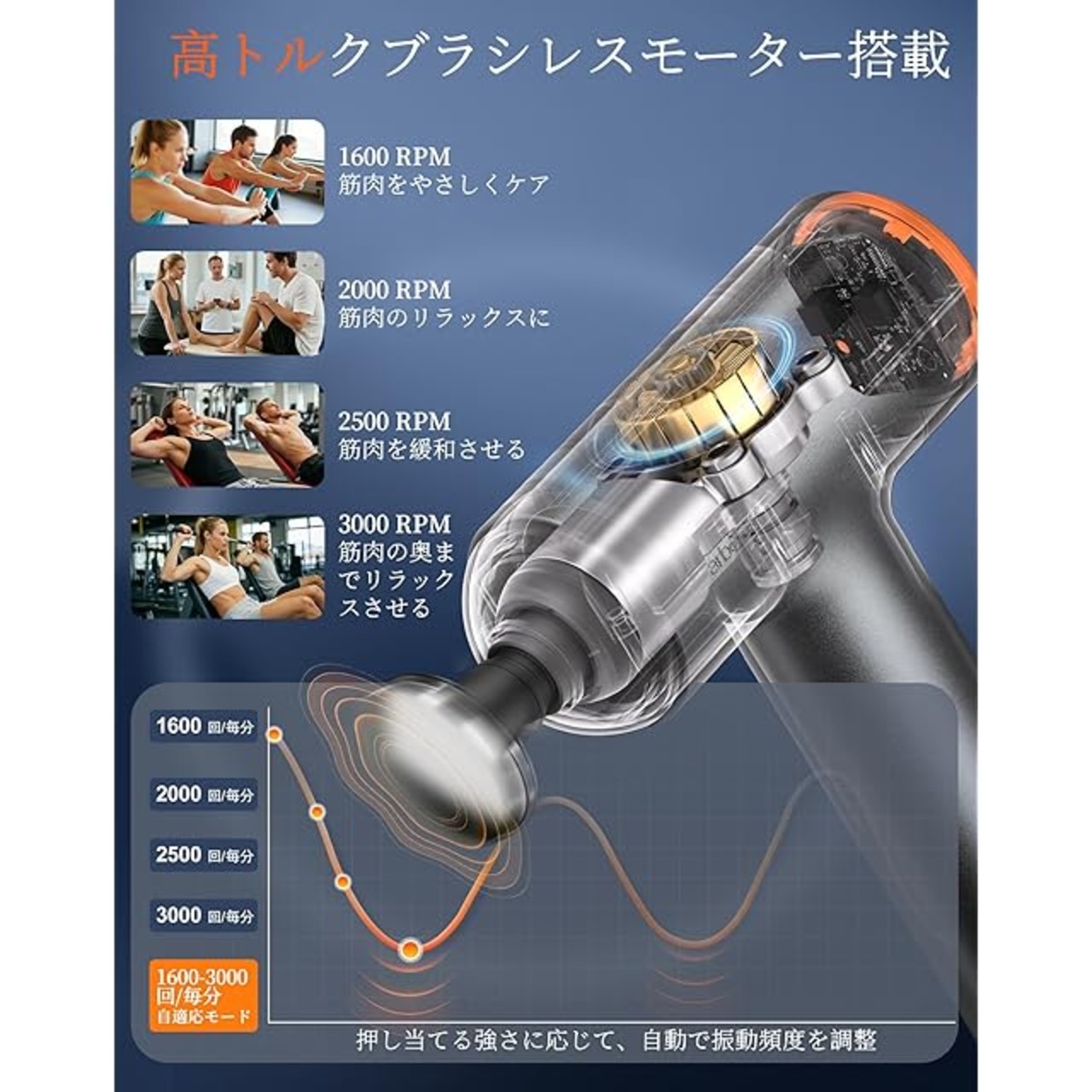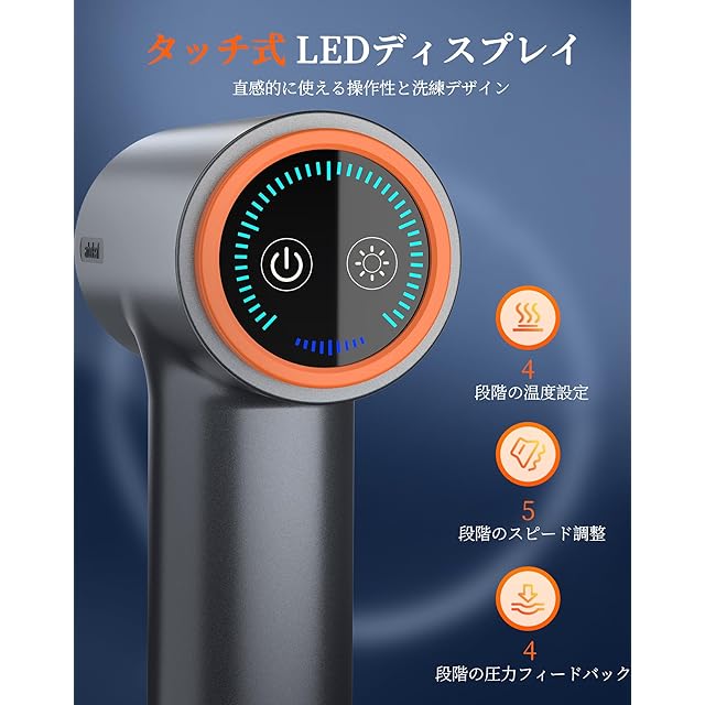「3色圧力表示 – 直感的にわかるフィードバック」押し当てる強さに応じてLEDリングの色が自動で変化。弱圧はグリーン、中圧はオレンジ、強圧はレッドで表示され、加圧レベルをひと目で確認できます。ワンタッチ操作で1600〜3000回/分まで、6段階の振動強度を簡単に調整可能。お好みに合わせて自在に設定できます。10mmのストロークにより、筋肉の奥深くまでしっかりアプローチ。運動後のケアや日常のリフレッシュに最適です。
