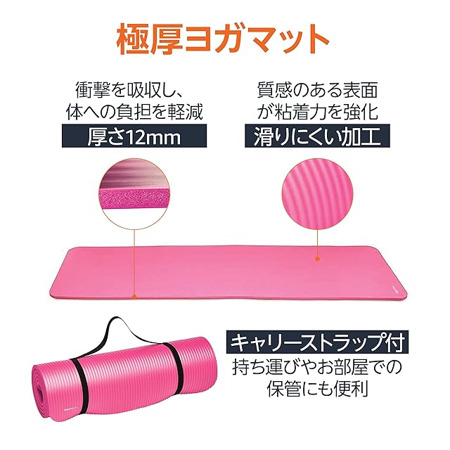 ベーシック ヨガマット 厚め 12mm キャリーストラップ付 トレーニングマット ストレッチマット ピラティスマット 188×61×1.2cm ピンク