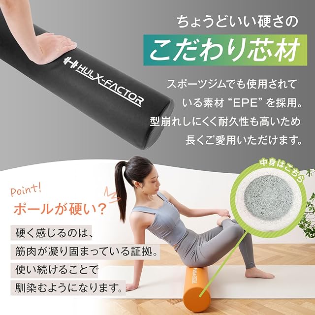✅ハルクファクターのストレッチ用ポール(エクササイズポール)は98cmのロングサイズ。男女問わず、無理なく上半身を載せることができます。