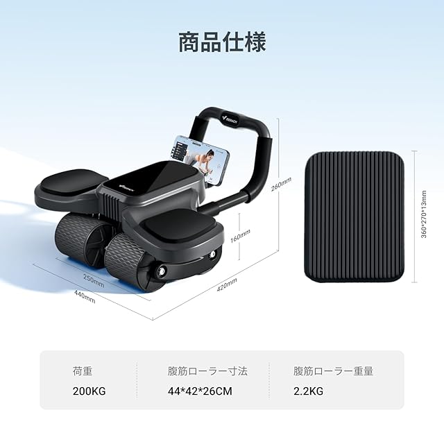 【スマホスタンド・膝マット付き&肘マットデザイン】この腹筋ローラーはスマホスタンドを内蔵しており、市場にある多くのスマホと互換性があり、運動しながら動画を観ることができます。肘を置く底部には厚みを増した柔らかいマットが設計されており、肘を保護しながら快適さを高めています。膝を保護するために、膝マットも付属しています。膝マットサイズ:365*275*15mm。
