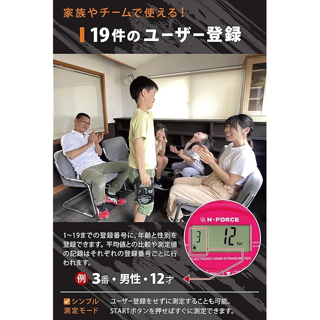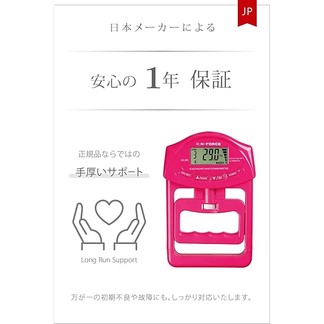 【※乾電池の挿入について】 本体裏面の電池ボックス蓋をスライドして開け、単4アルカリ電池を+が内側になるようにセットしてください。(電池がうまく入らない場合は、電池を指で回転させながら挿入することで簡単に入ります) 日本国内のスポーツジム、介護施設、学校、法人、団体への導入実績が多数あります。もちろん一般家庭でも多く使用されています。 大き目デジタルが特徴の握力測定器。N-FORCE正規品は、ユーザー登録機能付。 正規品ならではの機能1 ⇒ 前回の測定値を上回ると、液晶画面が教えてくれる。やる気が継続します。 正規品ならではの機能2 ⇒ 年齢/性別ごとの握力平均データがインプットされている。平均値は目標の目安になるので、とても便利です。 グリップの幅が自由に調整できるので、手の小さい女性や子供もご使用いただけます。 1年間の製品付き。 握力計測器必ず正規品の購入をお願いいたします。 【以外と知られていない握力の重要性】 ・重い荷物も持てるようになる ・握る力だけでなく、腕力の強化にもなる ・トレーニングすると、二の腕が太くなる デジタル液晶で0.1kg単位までがクッキリ表示されます。 最大90kgまで計測可能。以下の一般的なトレーニング器具との併用を推奨します。 ハンドグリップ ダンベル リストトレーナー トレーニングチューブ