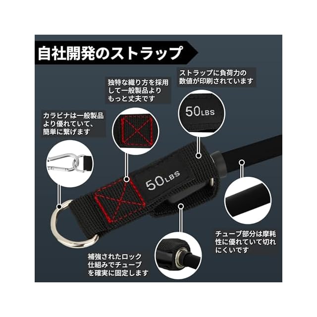 【高耐久性へのこだわり】:高品質の天然ラテックス素材および頑丈な足首ストラップを使用しております。チューブが破れるにくく、高強度の引っ張りに強いです。ハンドルは握り心地がよく、滑り止め仕様になります。長期間ご使用しても怪我のリスクが少なく、男性でも女性でもトレーニングできます。