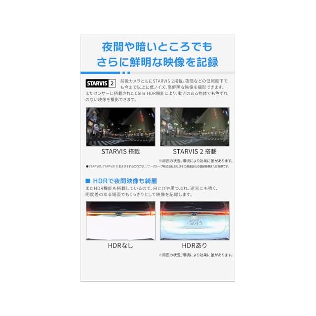 前後ともにSTARVIS 2搭載で夜間撮影性能が向上。STARVISよりもさらに低ノイズ・高鮮明な映像が記録可能。
