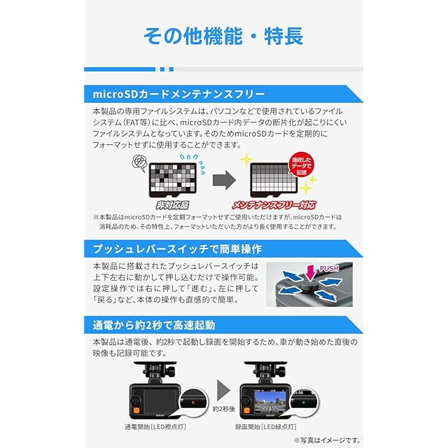 フロントカメラ部仕様:■撮像素子:1/2.8型 CMOSセンサー STARVIS技術搭載 ■有効画素数:最大200万画素 ■レンズ画角:水平138° 垂直70°(対角168°) ■F値:1.8