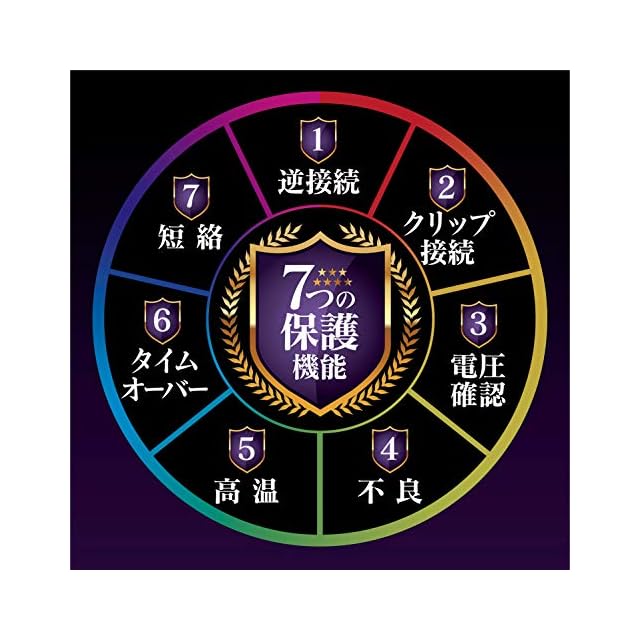 保護機能: 逆接続/クリップ接続/バッテリー不良/電圧確認/高温/タイムオーバー/短絡