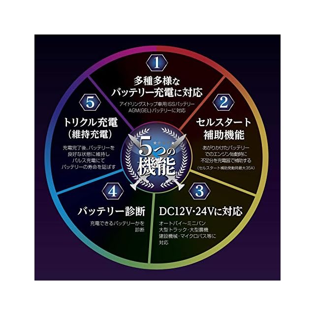 定格出力:DC12V/25A(充電時最大電流)・DC24V/12A(充電時最大電流)・35A(セルスタート補助機能時)