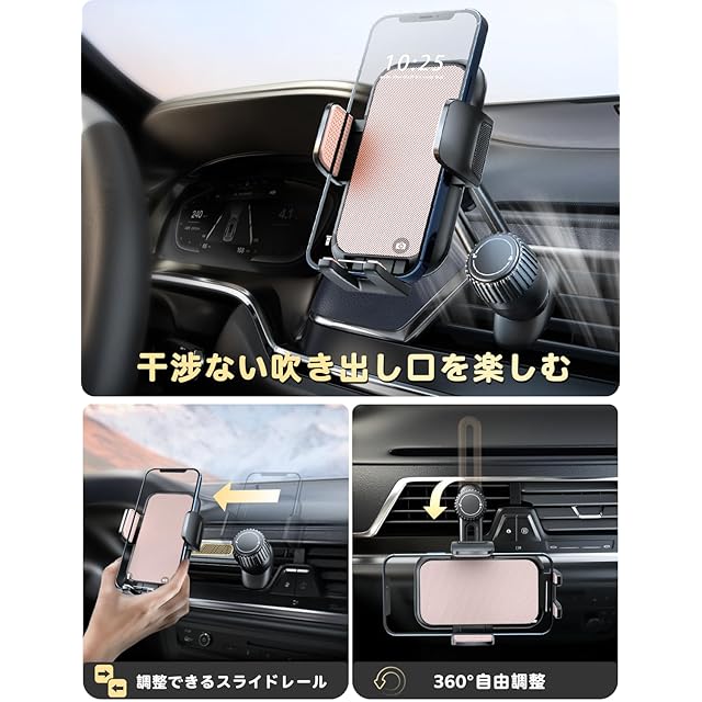 2025年に車載ホルダー新型モデル爆誕!✨✨・【スライドレール装置➤360°全方位調整!➤利便性抜群】 市販の車載ホルダーは、思い通りの長さと角度に調整できず、安全運転につながる可能性がある。弊社より独自開発された革新的な車載ホルダーはスライドレール装置を採用しており、長さ、方向や角度などを自分好みに自由調整可能です。360°全方位調整可能で、幅広い可動域が実現され、運転中の全然視野の妨げにならない!【ノンブロッキングデザイン】独創設計のおかげで、お使いのスマホをa/cの風量 (スマホの寿命にダメージを与えません) の影響を回避し、車内のエアコンがもたらす快適さをさらに得るのに役立ちます (空気の流れを妨げません)。