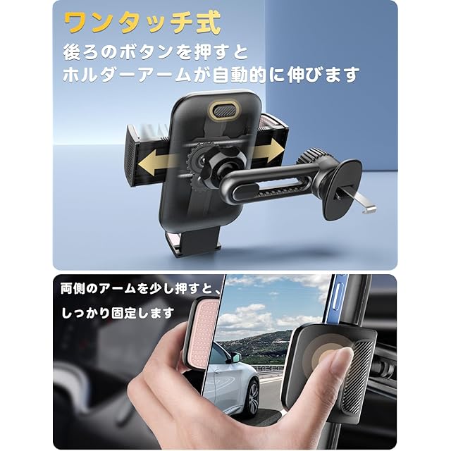 【片手で楽々ワンタッチ➤角度調整も自由自在➤】取り付け、取り外しは片手で一瞬!車の乗り降り時、手をわすらわせません。両側のボタンをワンタッチすると、片手で触れるだけでわずか0.1秒でサイドアームを開き、やすく利便性が高いです。多くのカー用品 スマホホルダーはほぼ横か縦方向にしか角度調整できません。だが、うちのすまほほるだーは違う!球状スイベルで 360°調整は可能です!反転にもでき、運転中簡単にスマホを手元近くまで操作できます。当社独自の設計による調整式携帯スタンドは調整範囲がより広く、運転中の全然視野の妨げにならない!快適で安全な視界を確保することが可能で、安心した運転をサポートします。