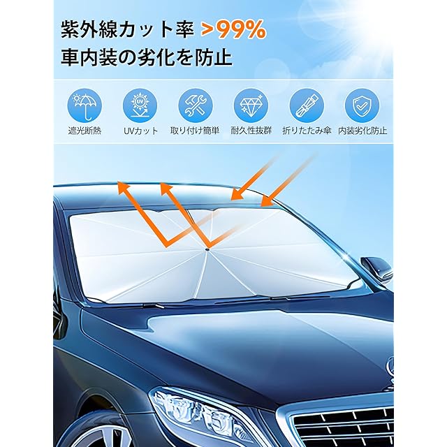 【紫外線の遮断率は 99%】車サンシェード傘面にはチタンシルバーの反射コーティングを精密に施し、高分子断熱材と組み合わせています。これにより、太陽光の 90% を効果的に反射し、紫外線の遮断率は 99% にも達します。駐車時には、車内の温度をも 15℃低下させることができ、涼しい車内空間を提供するだけでなく、ダッシュボードやシートなどの車内装飾部品が日光による劣化を受けるのを効果的に防ぎ、愛車の内装を大切に守ります。