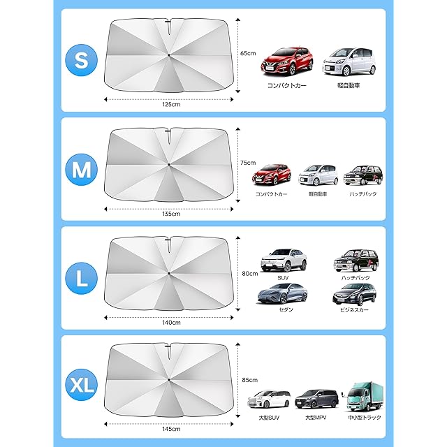 【便利と多用途】当社は、S、M、L、XL の 4 種類のサイズの商品を丁寧に用意しており、乗用車、トラック、SUV、ボックスカー、ミニバンなど、市場に出回っているほとんどすべての車種に幅広く対応できます。収納後のサイズは、L330×W120×H100mm で、長さは約 35 センチに過ぎず、傘のように簡単に持ち運びができます。適合性を確保するため、注文をする前に、是非お車のサイズを測定してください。 ご注意:手動測定によるため、若干のサイズの誤差が生じる可能性があります。何卒ご理解のほど、お願い申し上げます。